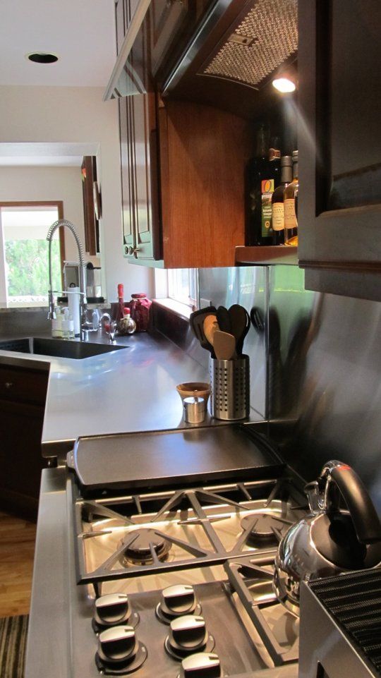 Pentru a realiza un aspect modern, proaspat, a fost inlocuit vechiul blat cu un unul lucios, din otel si o noua chiuveta functionala, integrata in acest ansamblu. Insula si barul au noi blaturi din granit, perfecte pentru noul stil adoptat. Vechiul aragaz a fost schimbat si el cu o varianta moderna de plita pe baza de gaz.