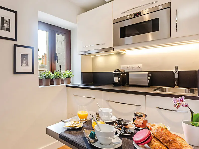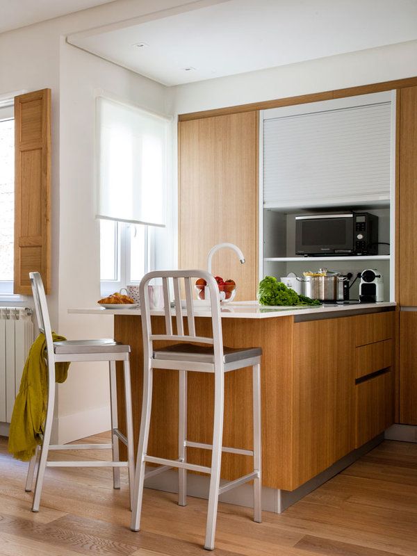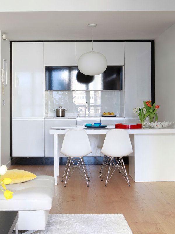De la solutii ingenioase precum incastrarea electrocasnicelor in mobilier, piese adaptate formei spatiului si mese rabatabile sau extensibile, pana la mobilier suspendat si etajere in locul dulapurilor voluminoase, la suprafete netede, lucioase, de un alb imaculat si pereti folositi in moduri ingenioase pentru depozitare.