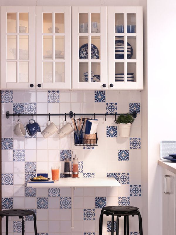Avem de-a face cu o chicineta dragut amenajata. Peretele accent realizat dintr-un mozaic alb-albastru cuprinde o masa rabatabila si dulapurile superioare. Din nou, o zona foarte mica dedicata bucatariei, dar armonios pusa in valoare.