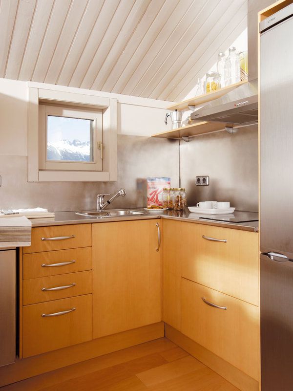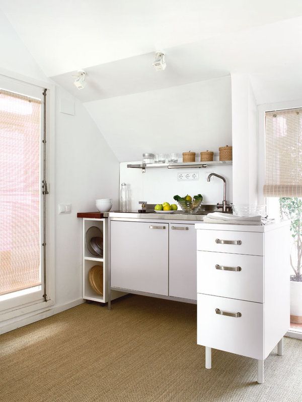 O chicineta dotata cu strictul necesar. Tavanul inclinat lasa loc doar montarii unei etajere. Corpul alaturat cu sertare preia o parte din depozitare si separa in acelasi timp spatiul bucatariei de restul incaperii. Este o solutie de compromis pentru locuintele mici amenajate la mansarde.