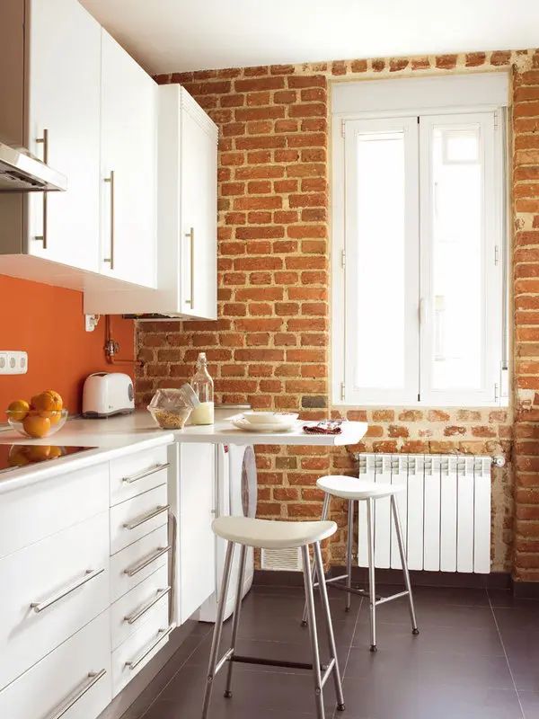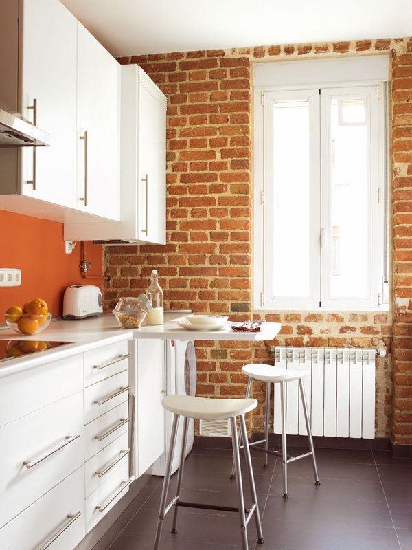 O bucatarie mica, compacta, lineara cu un perete de caramida ca accent in amenajare, distragand privirea de la marimea camerei. O idee excelenta in acest spatiu este masa rabatabila. Albul mobilierului reflecta lumina si amplifica spatiul.