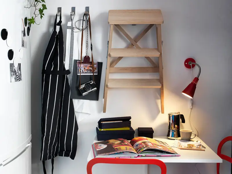 Cand vorbim de spatii mici, utilizarea peretilor pentru stocarea pe verticala devine o practica comuna. De remarcat cum in acest caz, masuta functioneaza ca loc pentru luat masa cat si ca mini-birou.