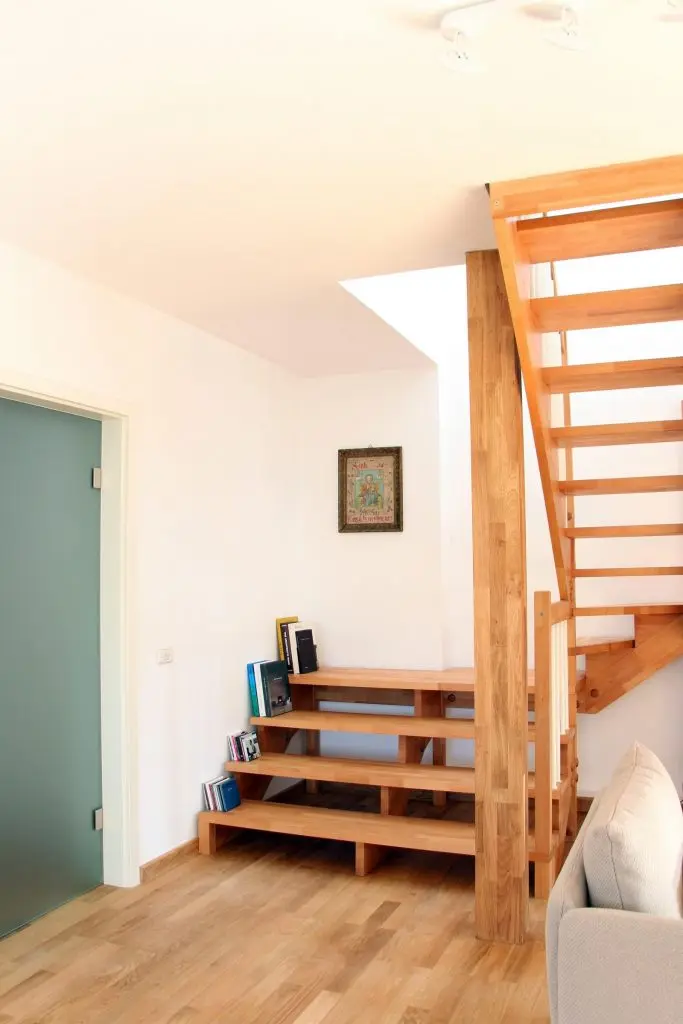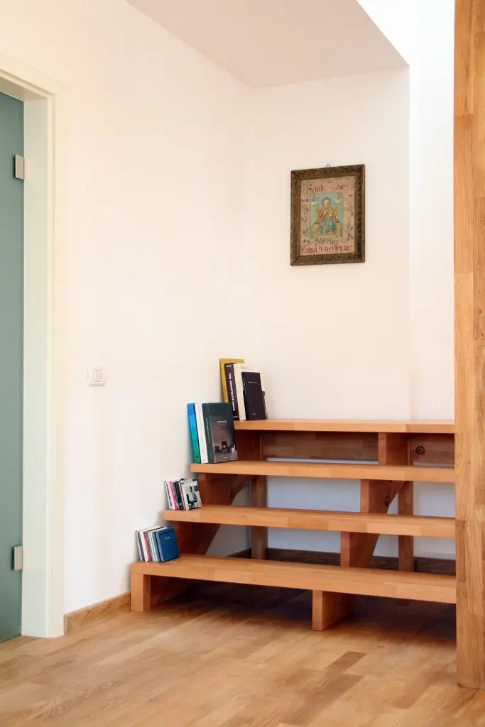 La baza scarii este improvizat o mini-biblioteca, treptele acesteia servind drept rafturi pentru carti.
