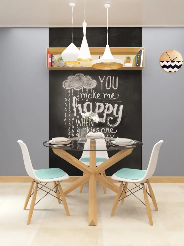 Ce face ca proiectul sa fie si mai interesant in ceea ce priveste zona de luat masa, este peretele pozitionat opus mobilierului, perete pe al carui mijloc se regaseste o tabla de scris.