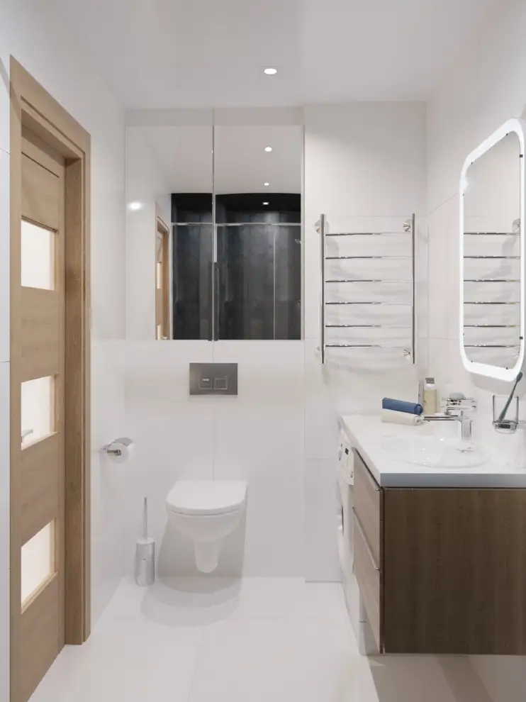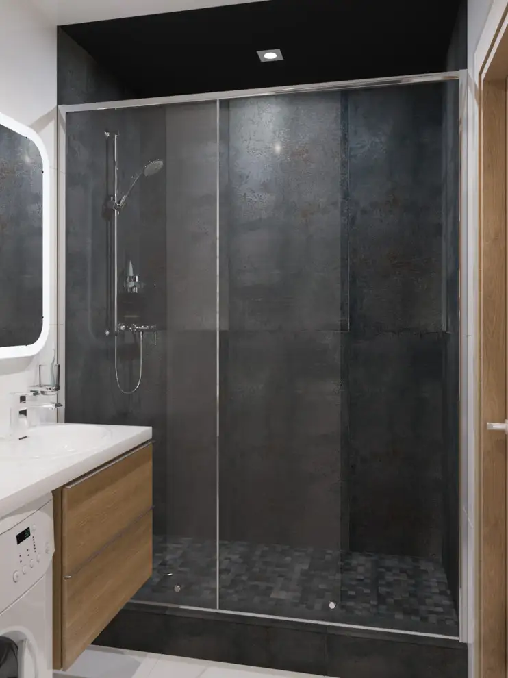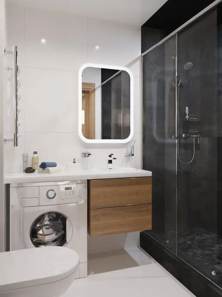 Spatiul restrans al unei bai poate da nastere unui loc cu adevarat confortabil prin selectarea unui mobilier minimalist si culori neutre precum negru, alb si ulm. Regasim aici elemente din sticla ce separa zona dusului de celelalte componete si maresc vizual suprafata prin asezarea in plan opus a unui dulap din oglinzi. Mobilierul este mic, simplu si incastreaza electrocasnicele.