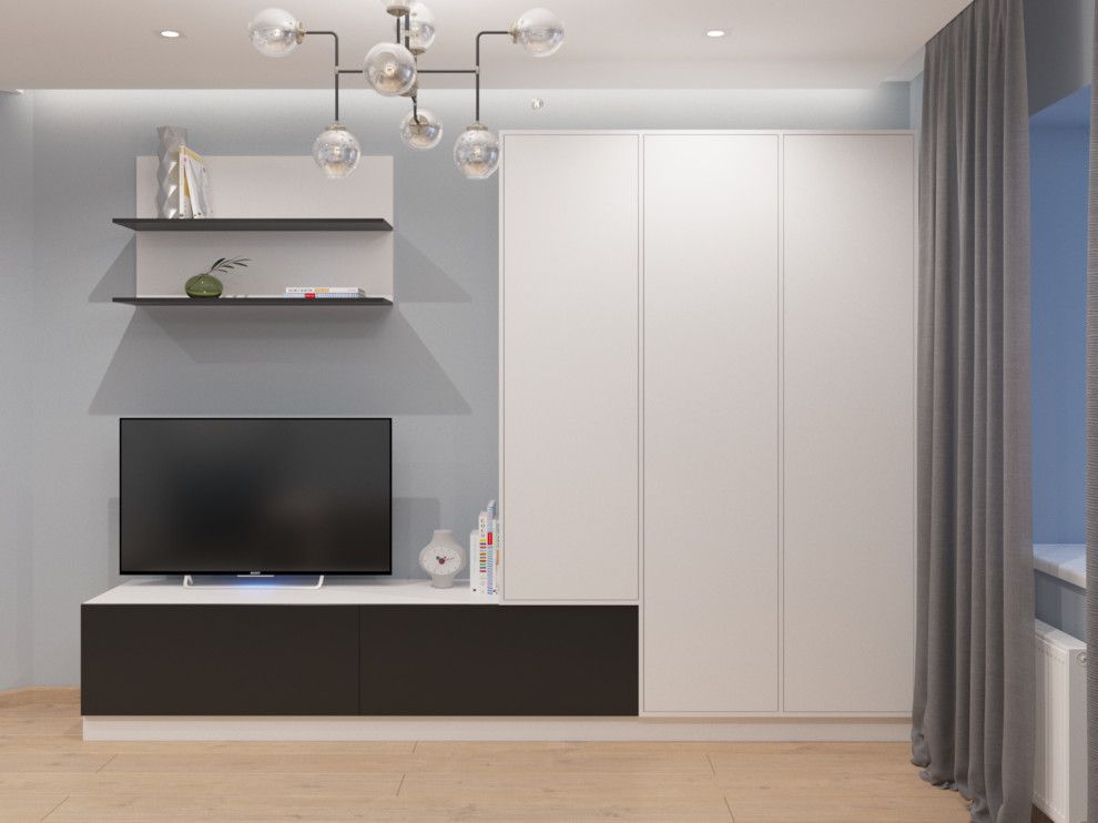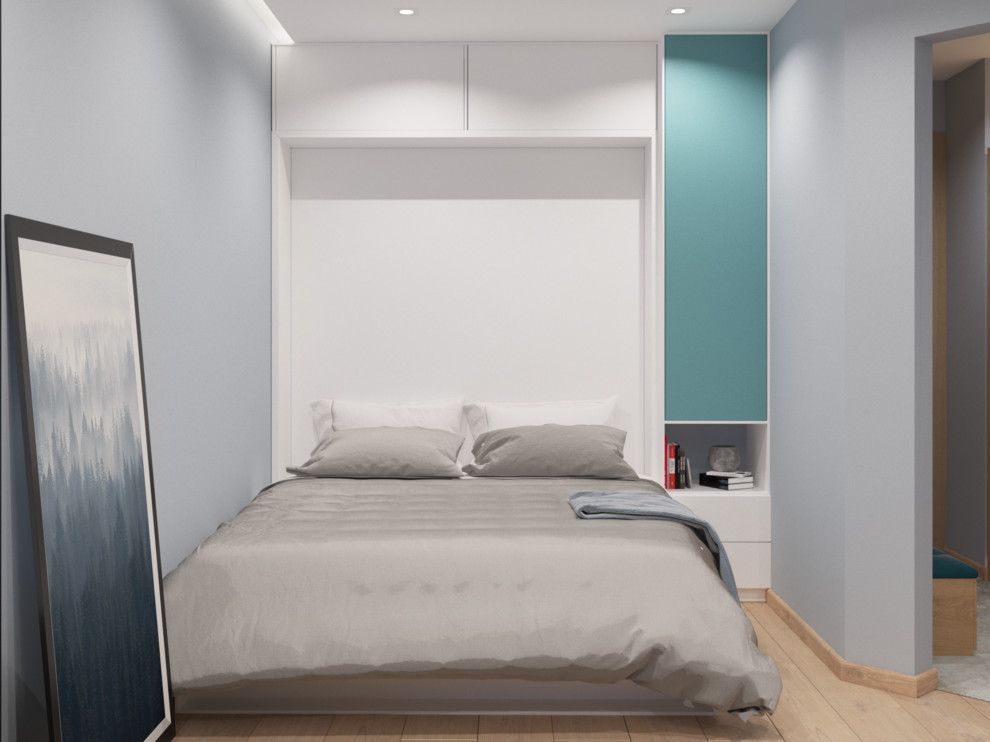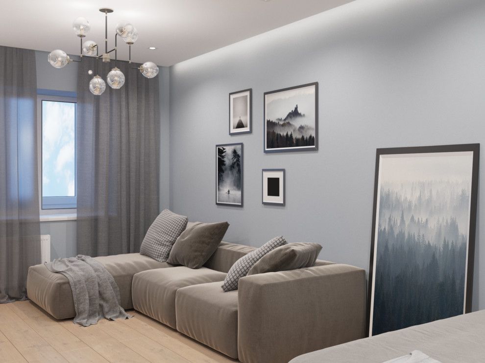 De aceasta data nu avem doar un spatiu de dormit ci doua zone de relaxare inglobate intr-una singura. Vizual, patul se pierde, mergand pe aceeasi linie cu mobilierul si lasa loc de exprimare canapelei pozitionate central. Diferitele nuante de gri sunt culorile predominante ale camerei iar modernul se lasa evidentiat prin accentele subtile decorative precum tablourile si corpurile de iluminat.