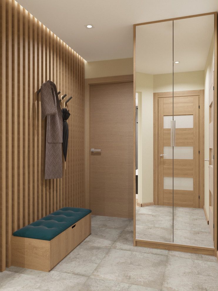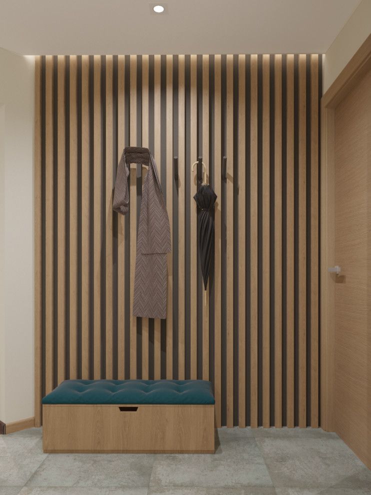 Lemnul este de aceasta data cel care da tonul la pasirea in interiorul apartamentului. Un hol de mari dimensiuni, al carui focus principal este lemnul, ne aduce in prim plan un cuier nonconformist format din grile de lemn, cuier ce ofera continuitate prin unirea pardoselii cu tavanul.