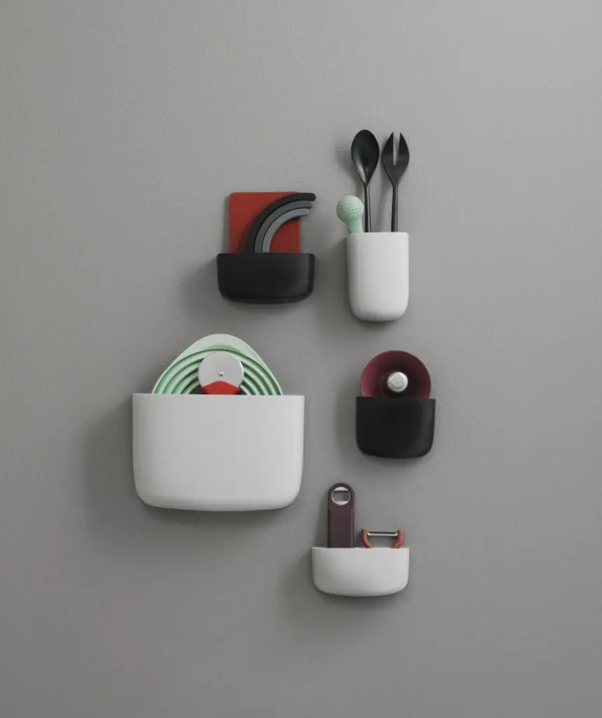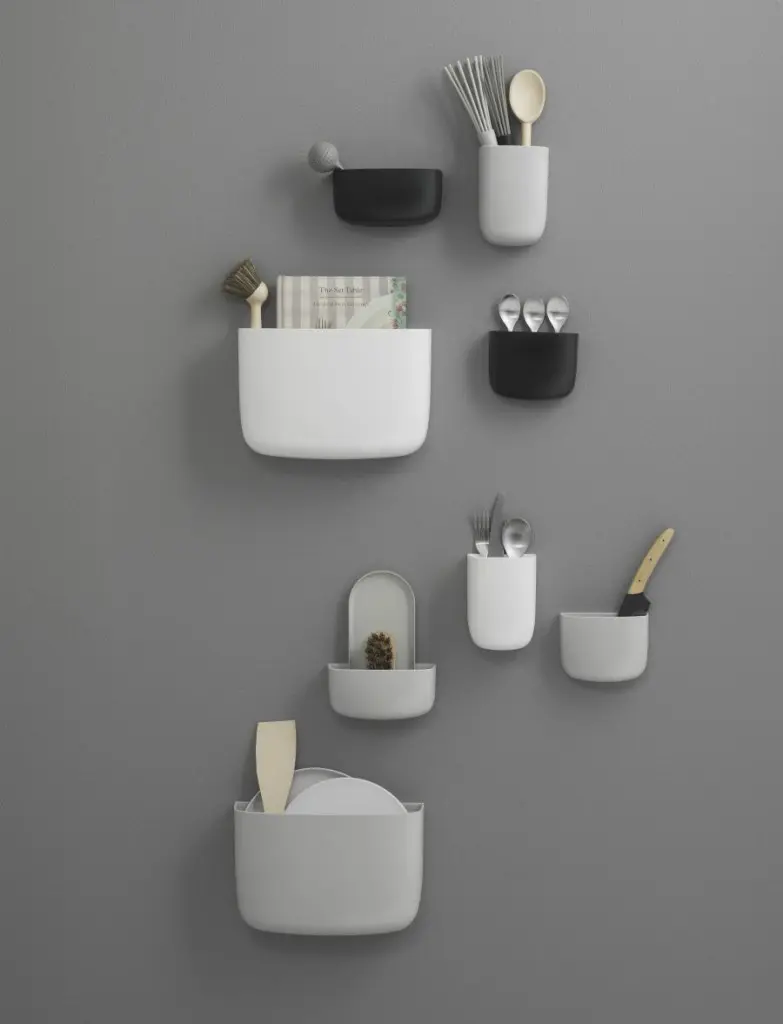 Aceste buzunare colorate sunt disponibile in patru dimensiuni si pot fi utile pentru numeroase intrebuintari. Se pot pune in ele obiecte de birotica, obiecte de bucatarie sau chiar mici ghivece cu flori. Ceea ce le fac niste solutii de stocare care pot fi montate in bucatarie, sufragerie sau chiar la birou. Nuantele in care sunt fabricate sunt extrem de echilibrate si de placute si pot fi integrate in multe stiluri moderne de design interior.