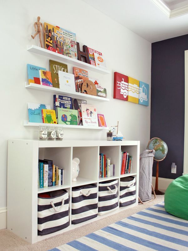 Organizarea este cuvantul cheie in orice camera de copil. In acest caz etajerele si rafturile sunt inteligent folosite, ocupand si putin spatiu.