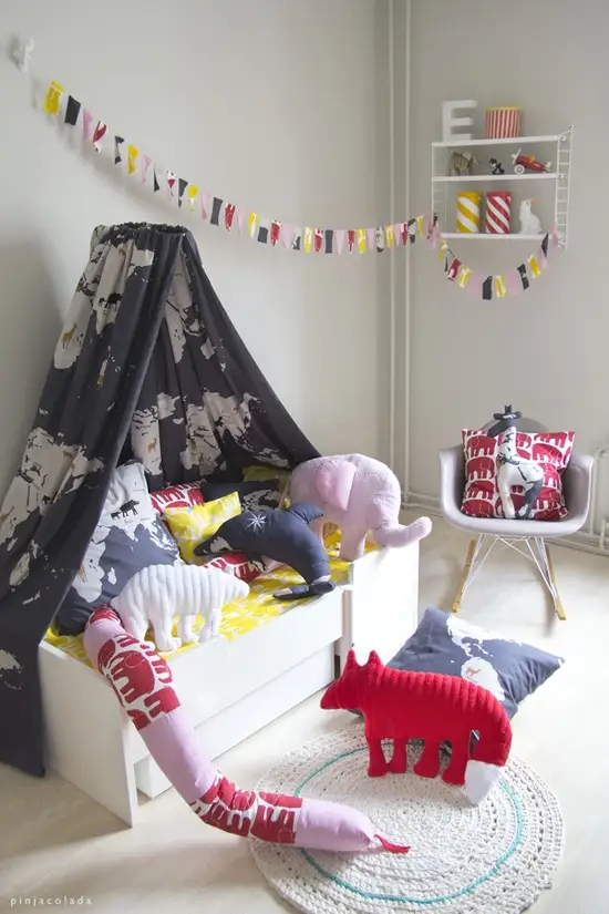 Pentru a folosi spatiul intr-un mod cat mai eficient, luati in calcul, piesele multifunctionale care sa sprijine decorul per ansamblu. Etajere, rafturi suspendate, cutii colorate pentru stocarea jucariilor, o masuta pentru colorat sau pernute confortabile pentru statul pe podea.