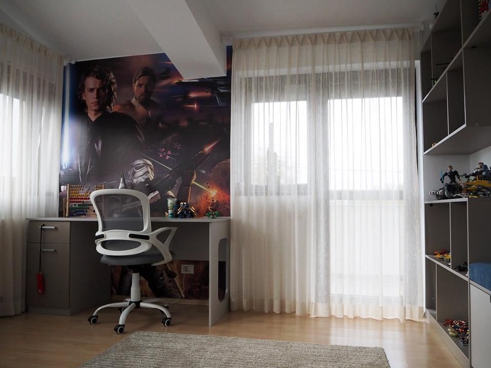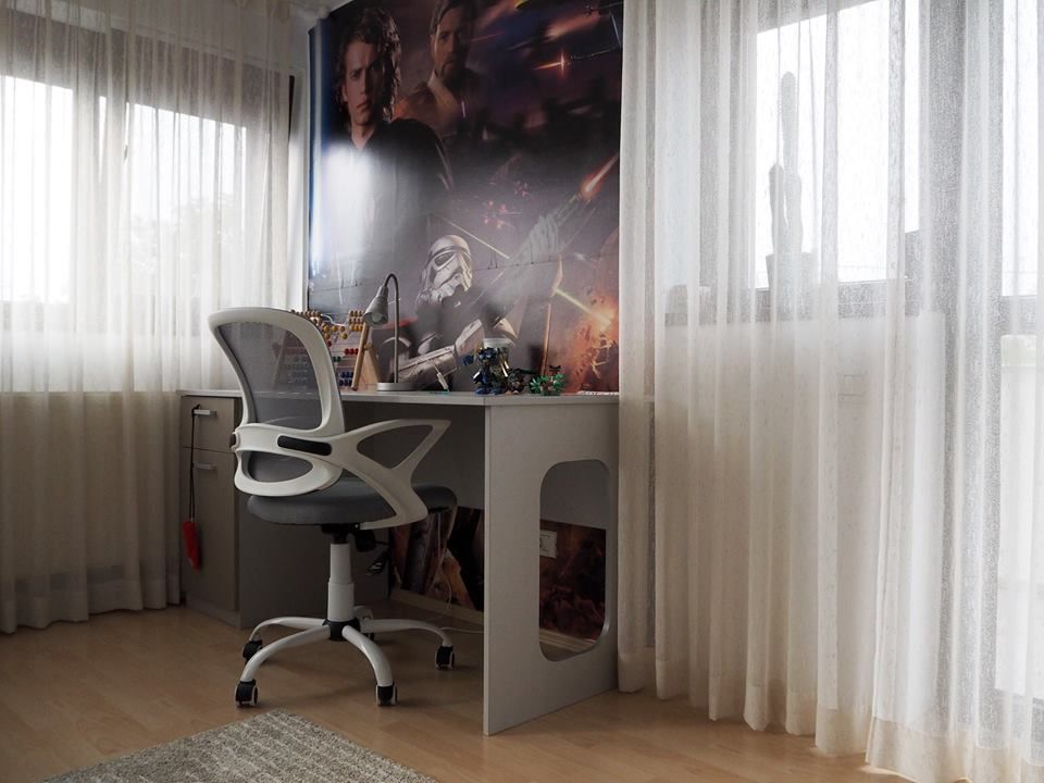 Deasupra biroului s-a folosit un fototapet cu Star Wars, pentru a stimula pofta celui mic de a sta la birou.
