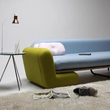 Cele doua parti verzi in forma de L, pozitionate la capetele canapelei formeaza atat bratele cat si picioarele canapelei. Partea de sezut din placaj este sustinuta de un suport central si doua picioare metalice egal raspandite. Cand partea textila formata din salteaua bleu este indepartata, portiunea din lemn se transforma intr-un balansoar.