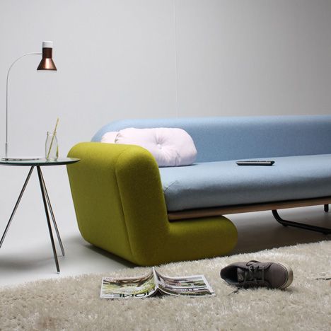 Cele doua parti verzi in forma de L, pozitionate la capetele canapelei formeaza atat bratele cat si picioarele canapelei. Partea de sezut din placaj este sustinuta de un suport central si doua picioare metalice egal raspandite. Cand partea textila formata din salteaua bleu este indepartata, portiunea din lemn se transforma intr-un balansoar.