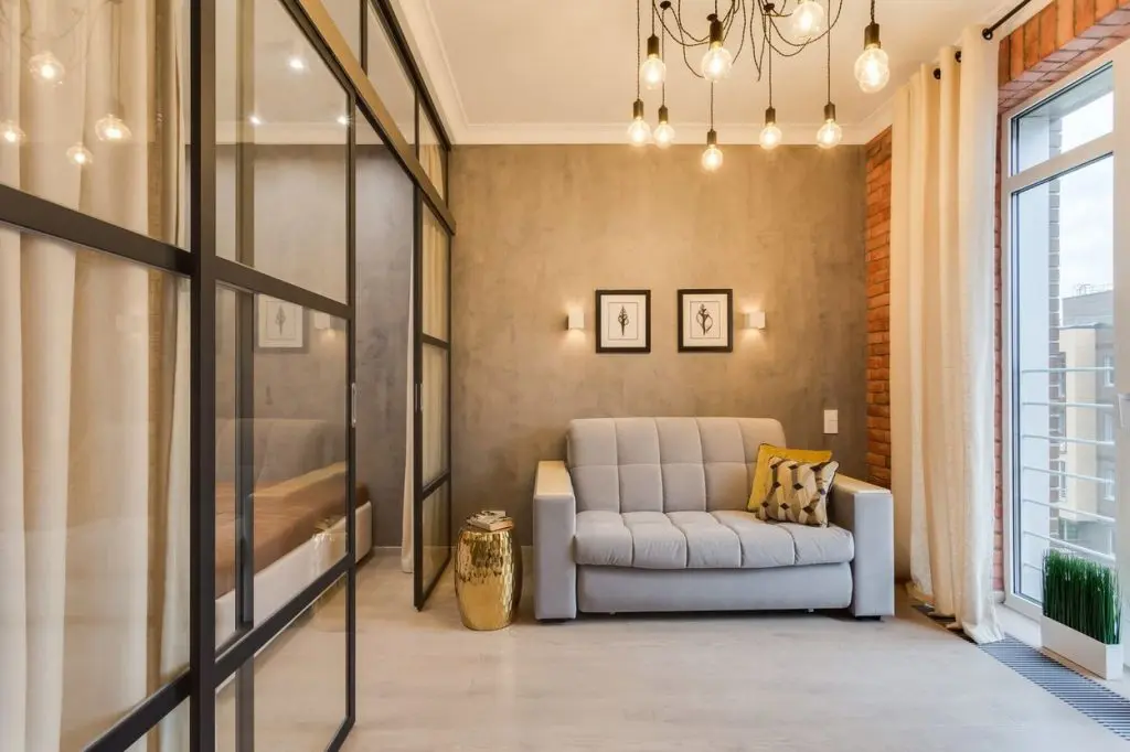 Sa vorbim si despre configuratia acestui apartament de 41 metri patrati. Initial, gandit ca un loft, cu o camera mare, spatiul a primit o noua functiune, aceea a dormitorului. Cu ajutorul unui perete interior anterior trasat, s-a putut amenaja un glasvand pe cadru de metal si usi culisante. A fost redus perimetrul livingului, insa beneficiarul primeste un somn odihnitor pe un pat confortabil. Pentru un plus de intimitate, au fost adaugate draperii.