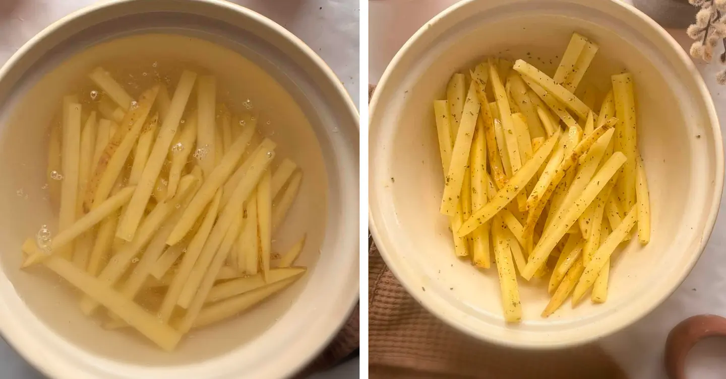 Cartofi: Orice cartofi mari, potriviți pentru copt, pot fi folosiți. Cartofii galbeni, cu textură cerată, sunt o alegere foarte bună. Este esențial ca feliile de cartofi să fie înmuiate înainte de gătire pentru a elimina excesul de amidon, obținând astfel o textură foarte crocantă.