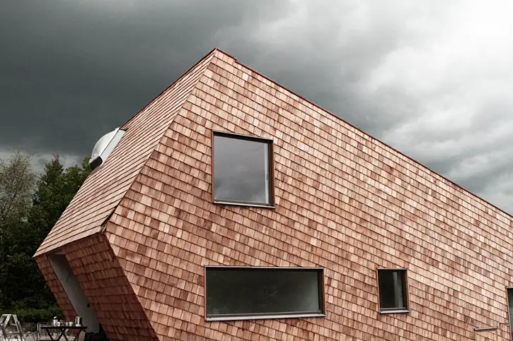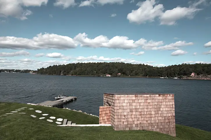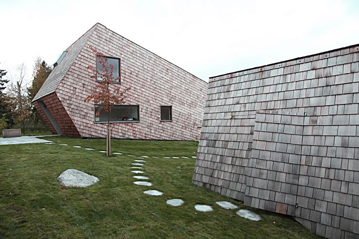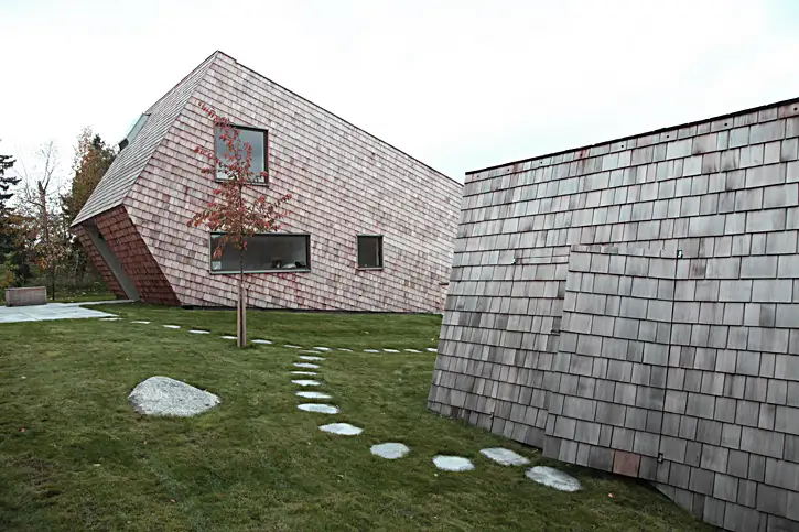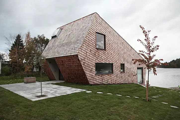 Cone House sau Casa Con este opera arhitectilor de laTrigueiros Architecturedin Suedia care au imaginat un proiect cu un design destul de abstract: forma de con placata cu sindrila si acoperis inclinat care de la distanta lasa impresia unui vapor esuat. Nu stim daca voit sau nu, insa si amplasarea casei, pe un deal plin de verdeata cu o priveliste spre o plaja privata absolut superba.