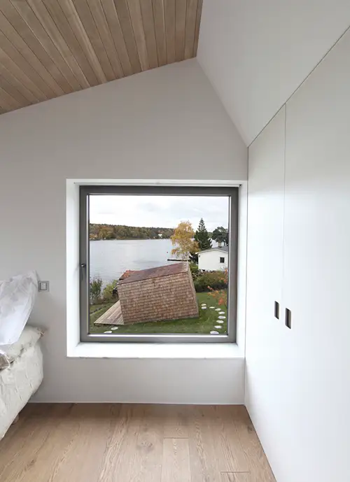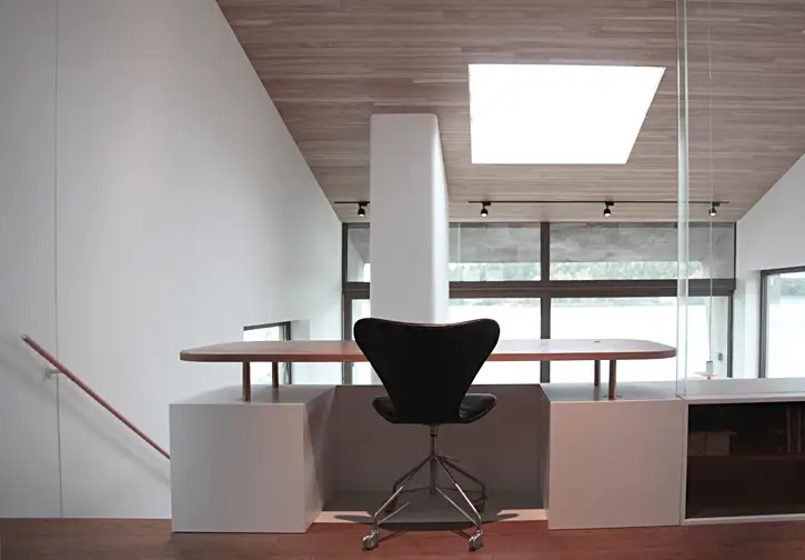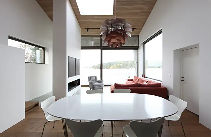 Partea mai inclinata a casei corespunde livingului care se prelungeste in exterior printr-o punte ce coboara spre tarm, acesta fiind punctul cel mai atractiv al casei.