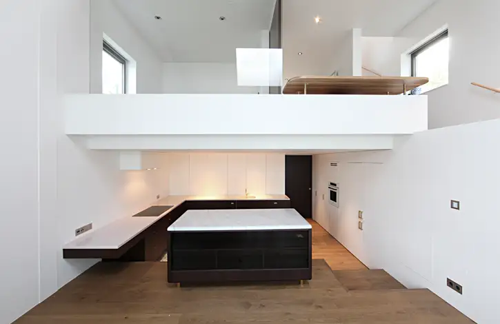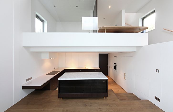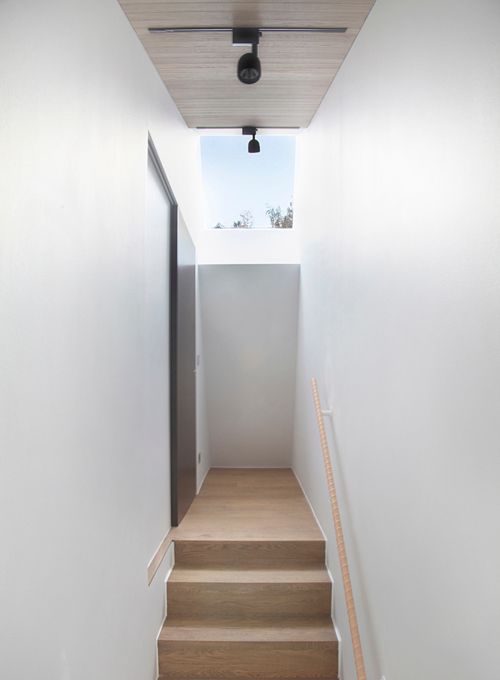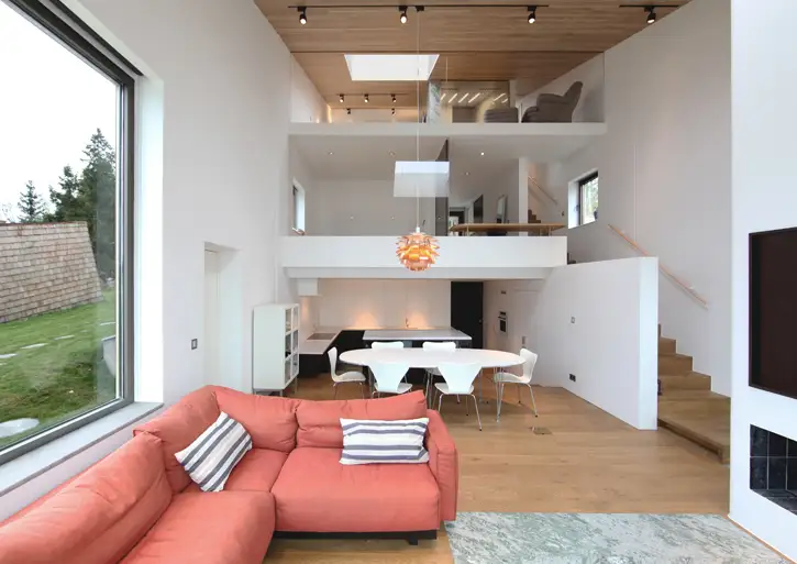 Pentru a crea mai multa spatialitate si a maximiza cantitatea de lumina naturala, inaltimea livingului a fost dublata si o fereastra larga ofera o cantitate mare de lumina naturala care patrunde astfel in toata casa. Cealalta parte a locuintei este divizata in trei niveluri legate intre ele prin scari.