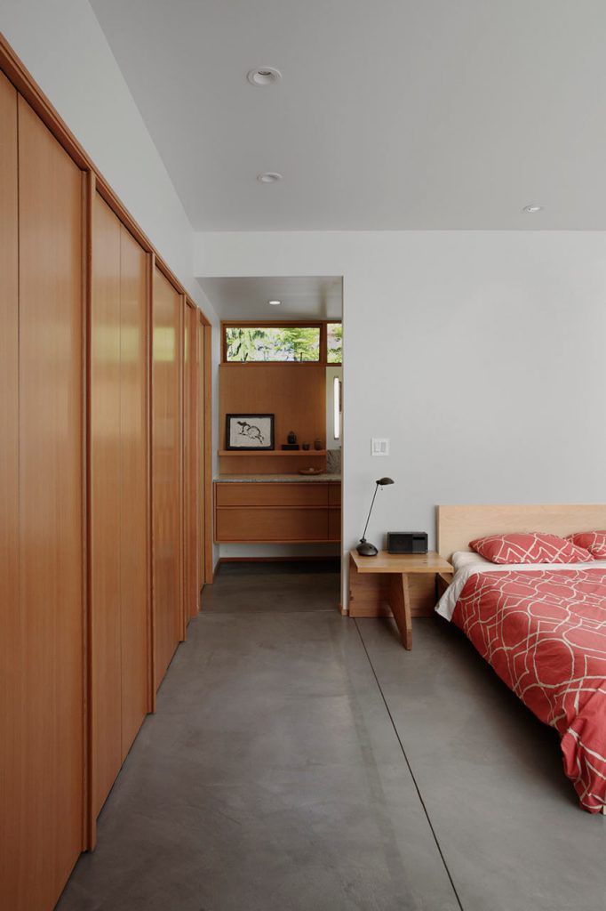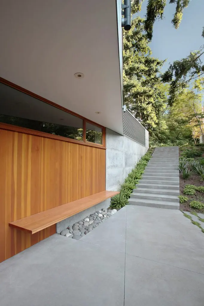 Astfel, arhitectii au creat o portiune betonata care se prelungeste din interior spre exterior in curte, ca o trecere lina intre cele doua spatii. Intreg exteriorul casei este un mix de beton, de gri si lemn, iar printre ele vom gasi mereu spatii verzi, plante cu flori si arbusti.