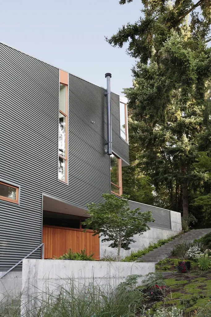 Casa cu design modern de astazi aduce o abordare interesanta din perspectivamaterialelorfolosite: lemnul si betonul se imbina atat in exterior cat si in interior creand o forma interesanta, practica dar si estetica in acelasi timp.