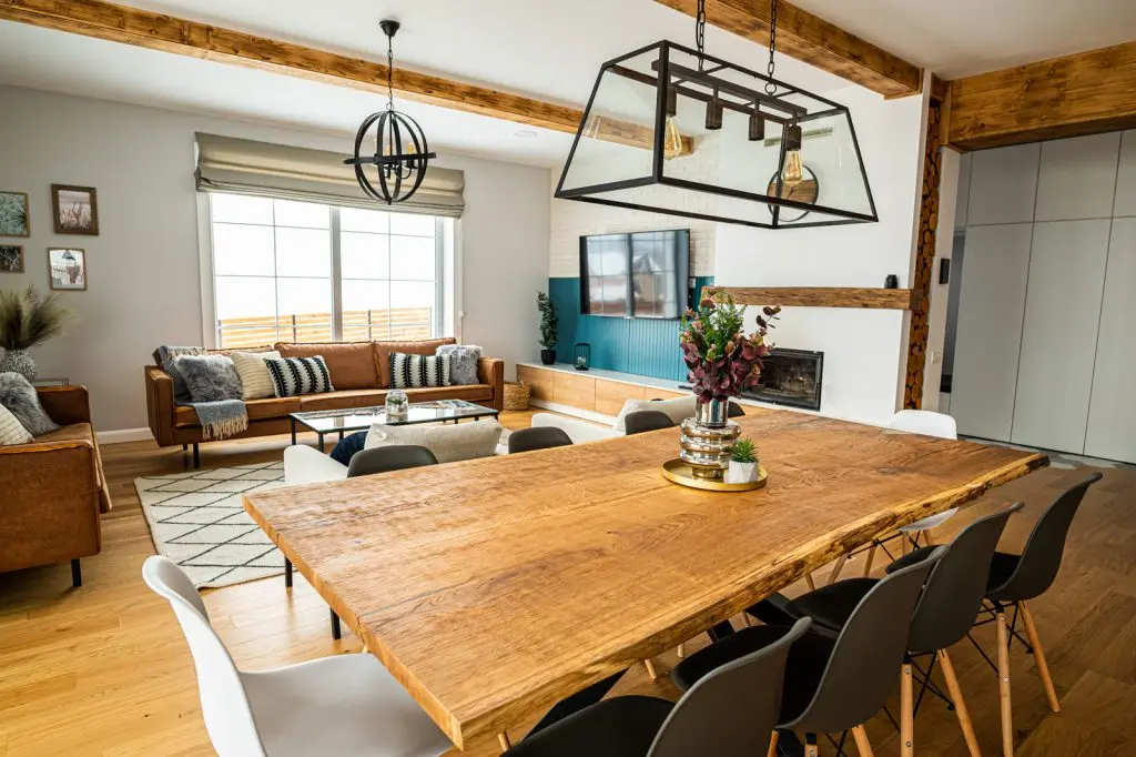 Proprietarii si-au dorit o locuinta confortabila, calduroasa, din care sa nu lipseasca grinzile aparente de lemn, baghetele ornamentale de la geamuri si storurile romane.