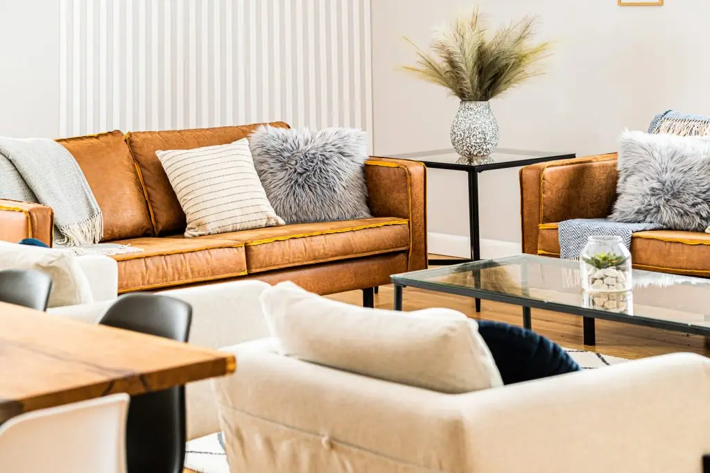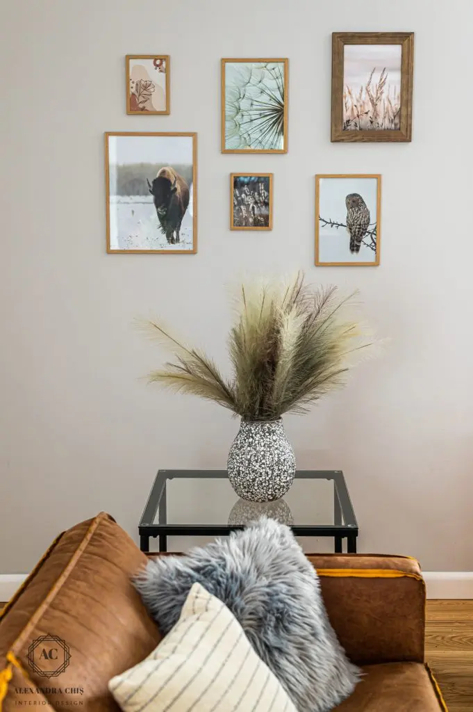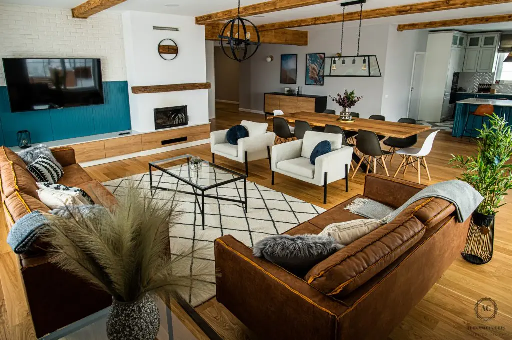 Prin finisajele alese, livingul este calduros pe tot parcursul anului: regasim caramida aparenta, o canapea din piele cu aspect vintage, multe accesorii din material textil.
