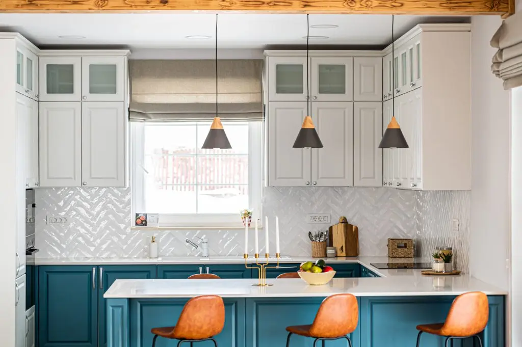 Intoarcerea blatului de lucru in forma literei “u” si transformarea acestuia in bar asigura o delimitare armonioasa a zonelor si totodata spatiu valoros pentru un mic dejun sau o gustare rapida.