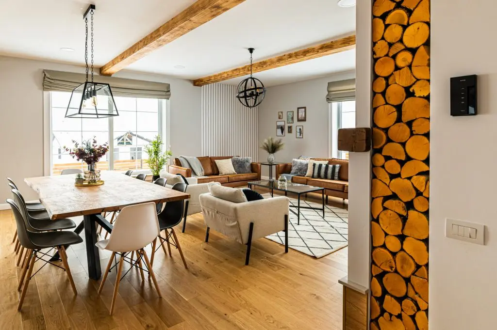 La intrarea in casa regasim o trecere jucausa intre gresia hexagonala si parchet. Pentru a delimita eficient zona de zi de hol a fost creat un perete de rigips, decorat cu busteni de lemn (care incalzesc casa si la propriu si la figurat).