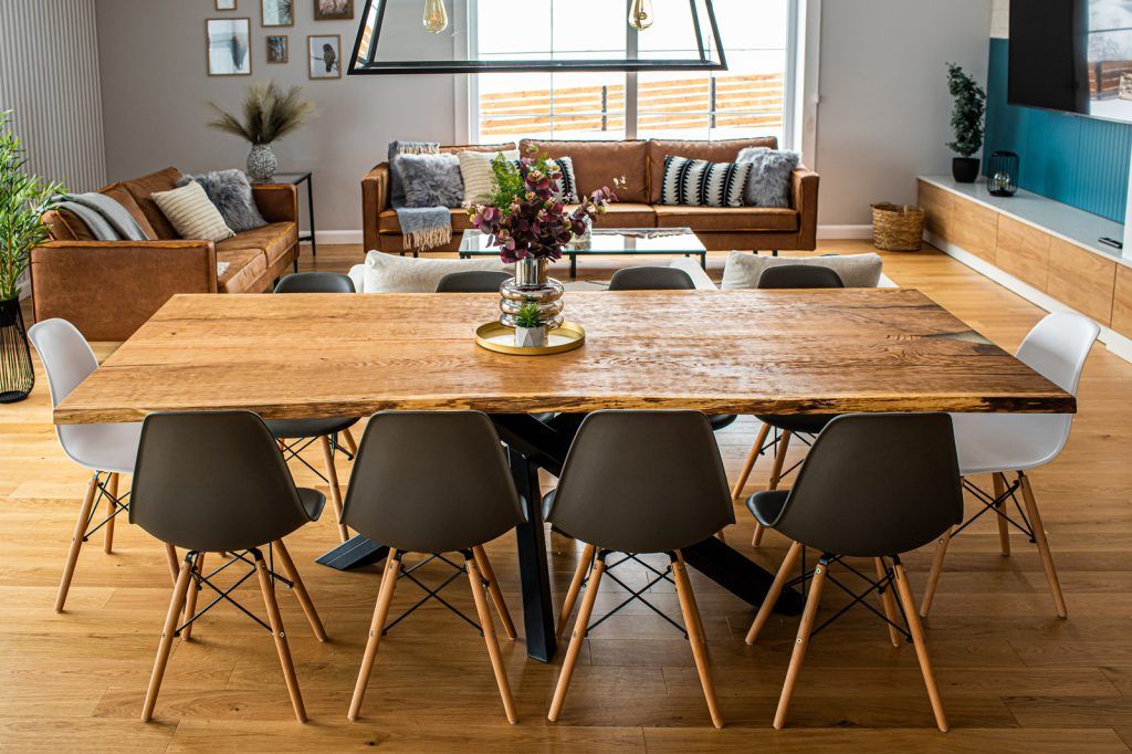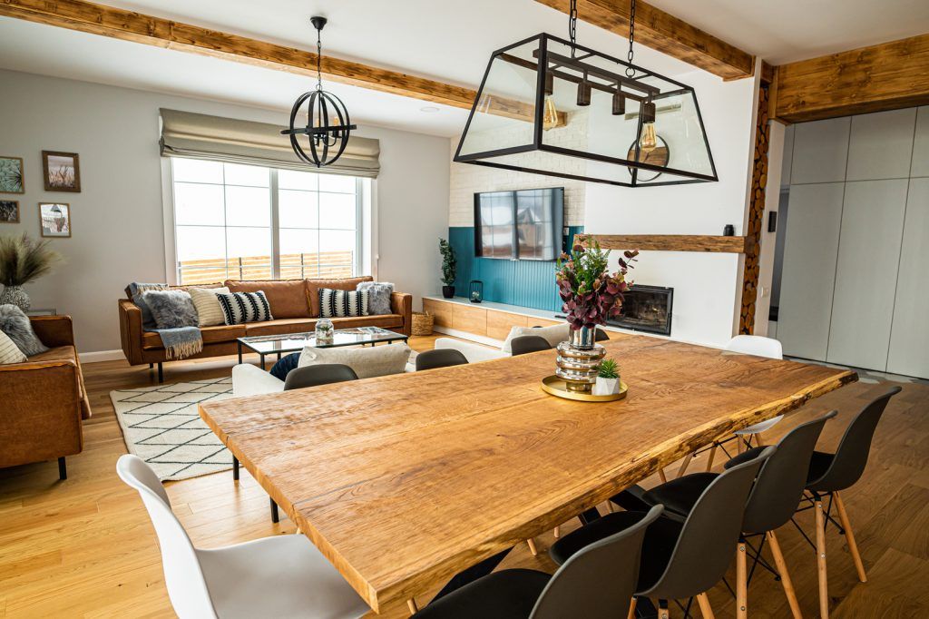 Locul de luat masa este locul in care se intruneste intreaga familie, astfel ca au optat pentru o masa mare, de zece persoane. Integrat perfect in decorul casei, blatul brut din stejar masiv (realizat de Urban Woods) constituie piesa de interes a zonei de zi. Candelabrul supradimensionat , in stil industrial, accentueaza importanta zonei.