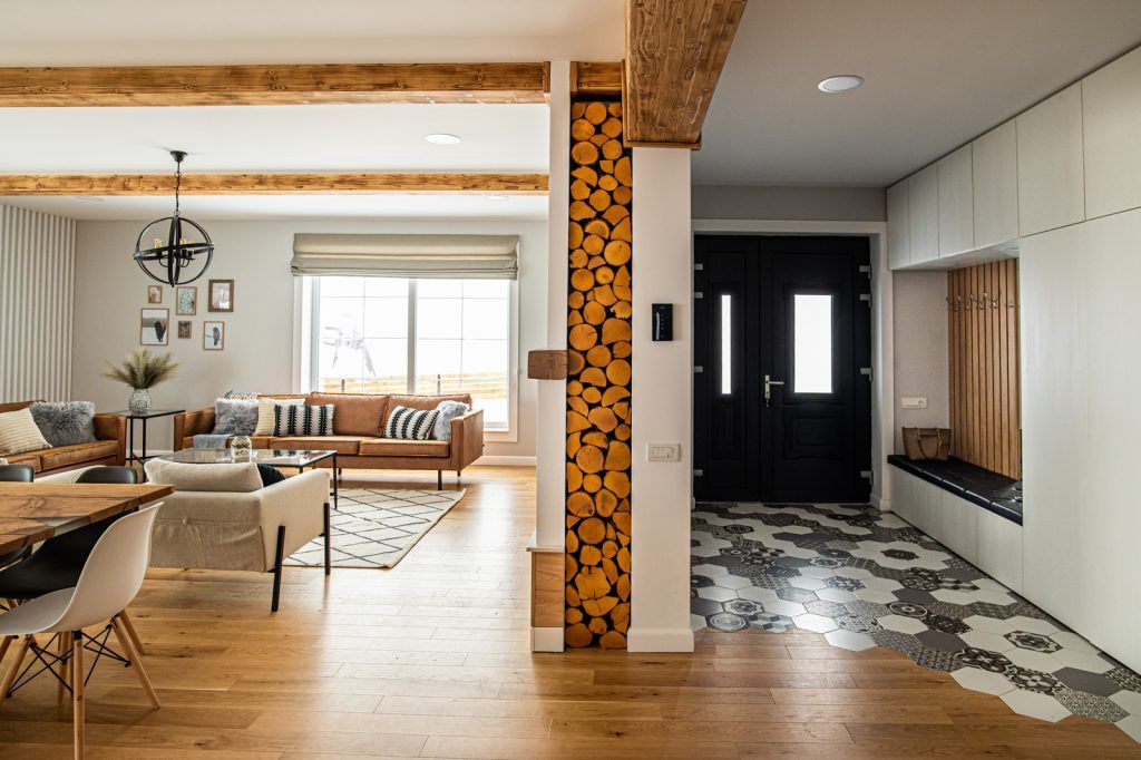 La intrarea in casa regasim o trecere jucausa intre gresia hexagonala si parchet. Pentru a delimita eficient zona de zi de hol a fost creat un perete de rigips, decorat cu busteni de lemn (care incalzesc casa si la propriu si la figurat).
