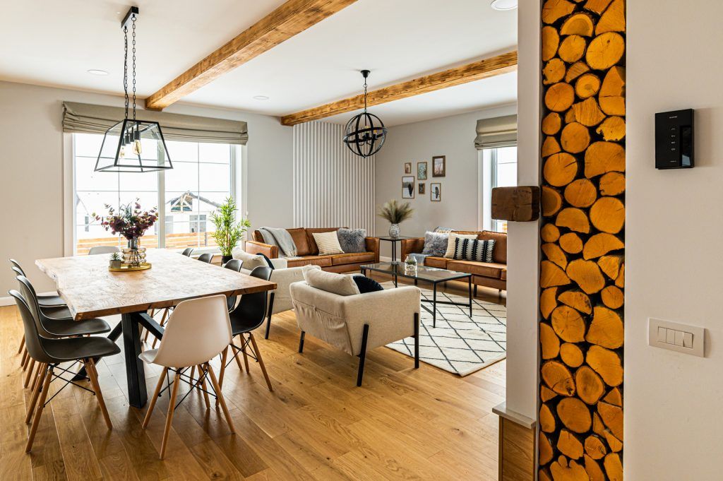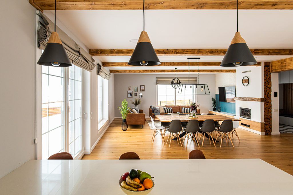 Proprietarii si-au dorit o locuinta confortabila, calduroasa, din care sa nu lipseasca grinzile aparente de lemn, baghetele ornamentale de la geamuri si storurile romane.