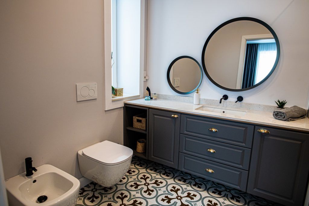 Mobilierul de bucatarie a fost realizat la comanda la K PE Mobart, din mdf frezat, in doua nuante: albastru la partea de jos ai alb-crem pentru corpurile suspendate.