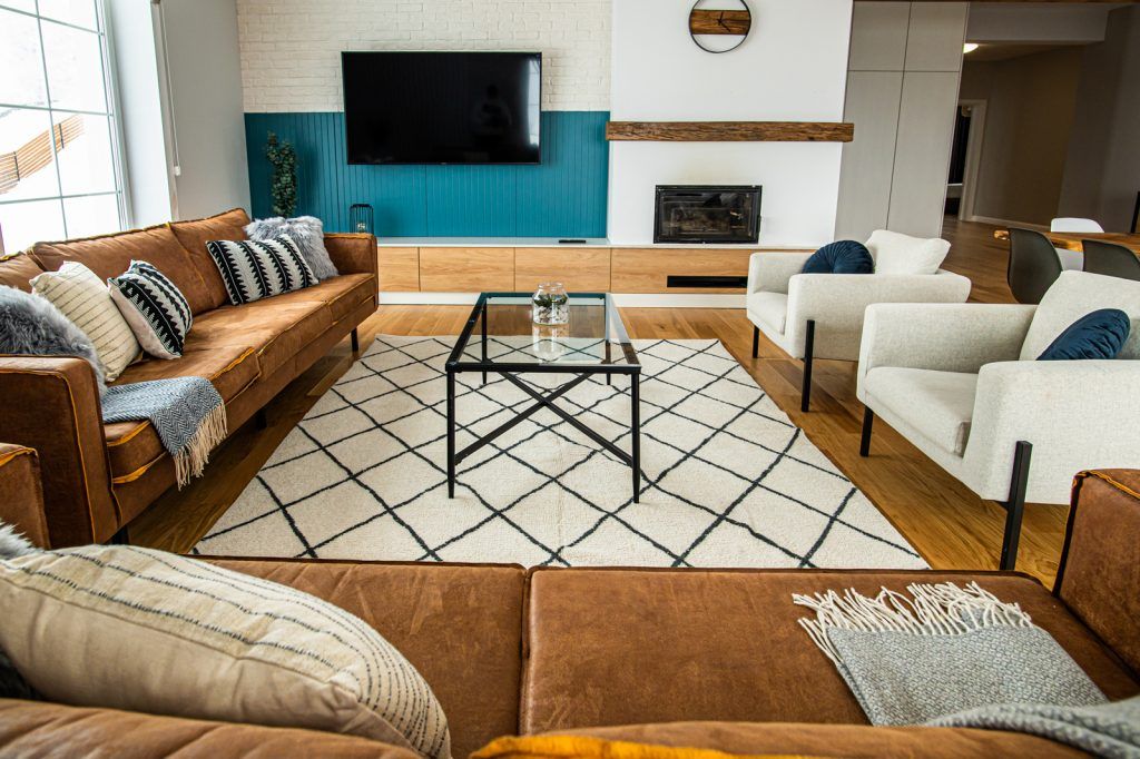 Prin finisajele alese, livingul este calduros pe tot parcursul anului: regasim caramida aparenta, o canapea din piele cu aspect vintage, multe accesorii din material textil.