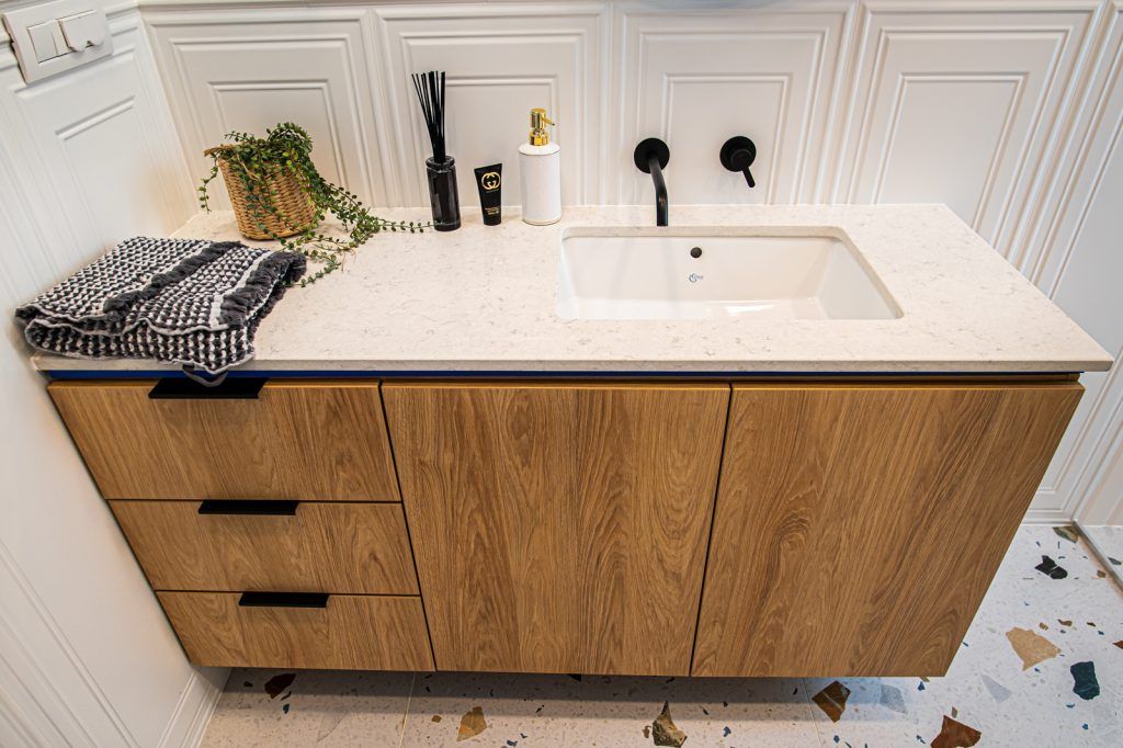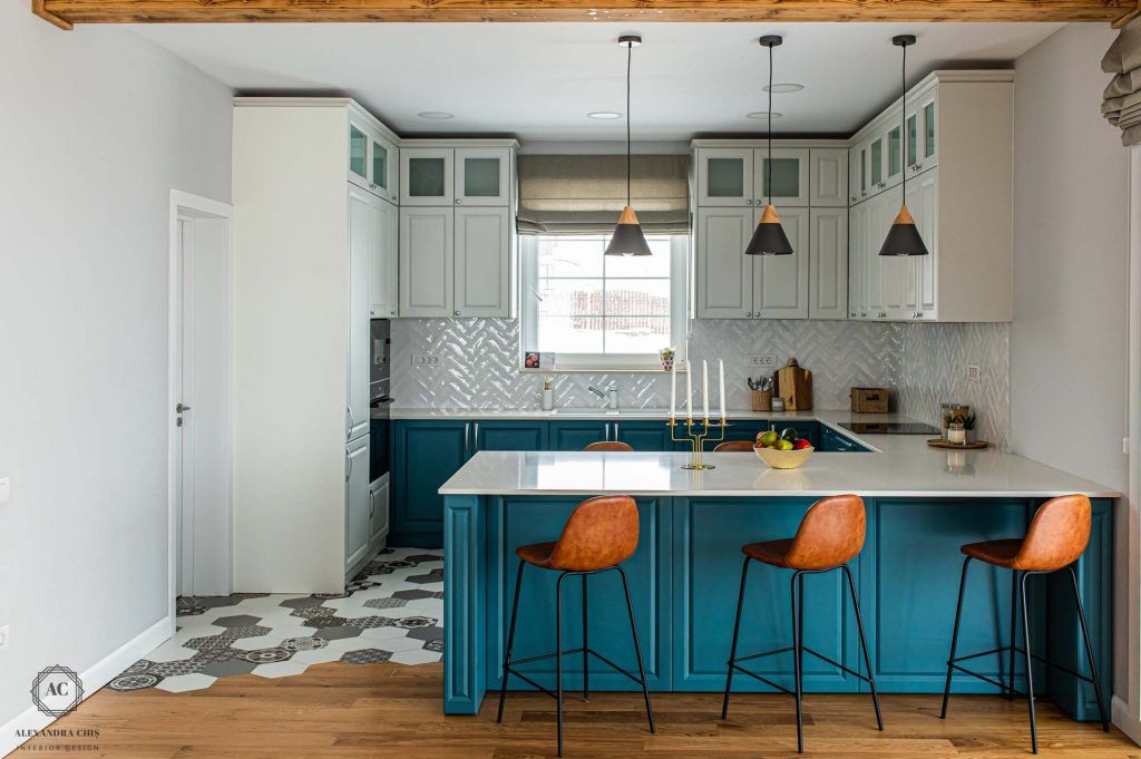 Intoarcerea blatului de lucru in forma literei “u” si transformarea acestuia in bar asigura o delimitare armonioasa a zonelor si totodata spatiu valoros pentru un mic dejun sau o gustare rapida.