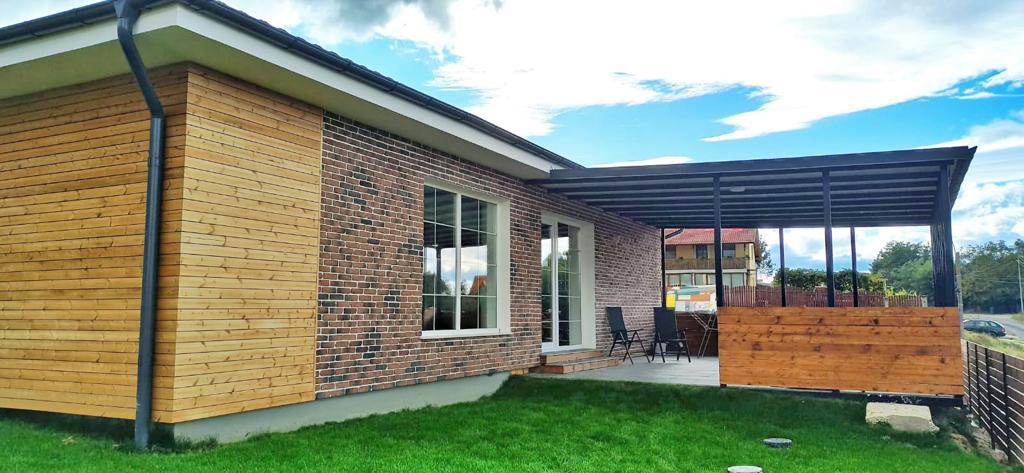 Alexandra a intervenit si la conceptul de finisare a fatadei; a optat pentru caramida aparenta si riflaje de lemn care contrasteaza armonios cu geamurile albe, elegante.