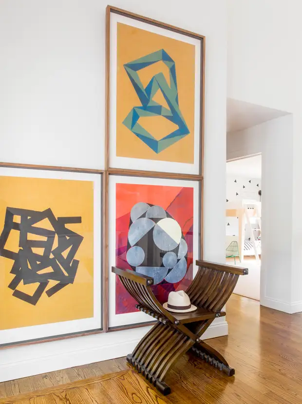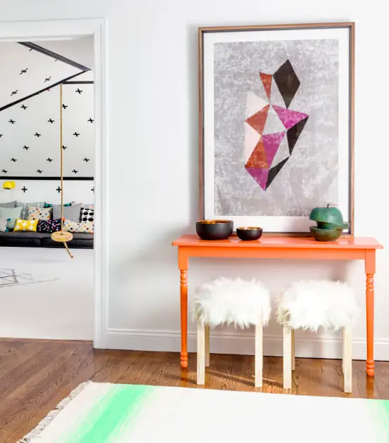 Jocul, ludicul sunt cuvintele in spiritul carora s-a conturat aceasta amenajare. Chiar de la intrare stii ca vei avea parte de o atmosfera de buna dispozitie si veselie. Usa de la intrare este galbena, consola din hol, reconditionata si vopsita in portocaliu.