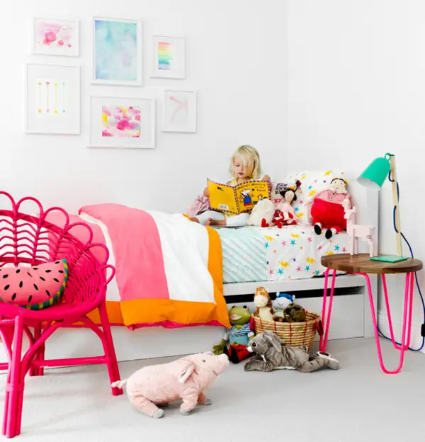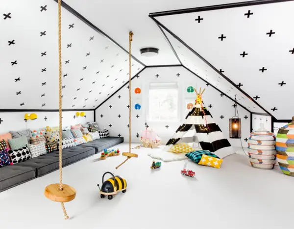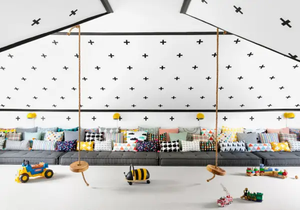 Variate nuante de galben, imprimeuri cu fructe, locuri de joaca la mansarda si multa veselie, cum altfel ai putea fi cand te inconjori de un asemenea decor!
