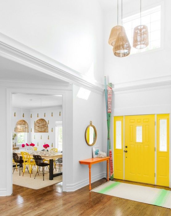 Jocul, ludicul sunt cuvintele in spiritul carora s-a conturat aceasta amenajare. Chiar de la intrare stii ca vei avea parte de o atmosfera de buna dispozitie si veselie. Usa de la intrare este galbena, consola din hol, reconditionata si vopsita in portocaliu.