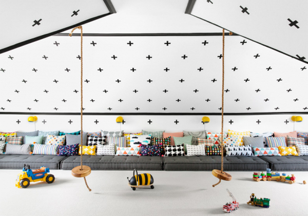 Variate nuante de galben, imprimeuri cu fructe, locuri de joaca la mansarda si multa veselie, cum altfel ai putea fi cand te inconjori de un asemenea decor!