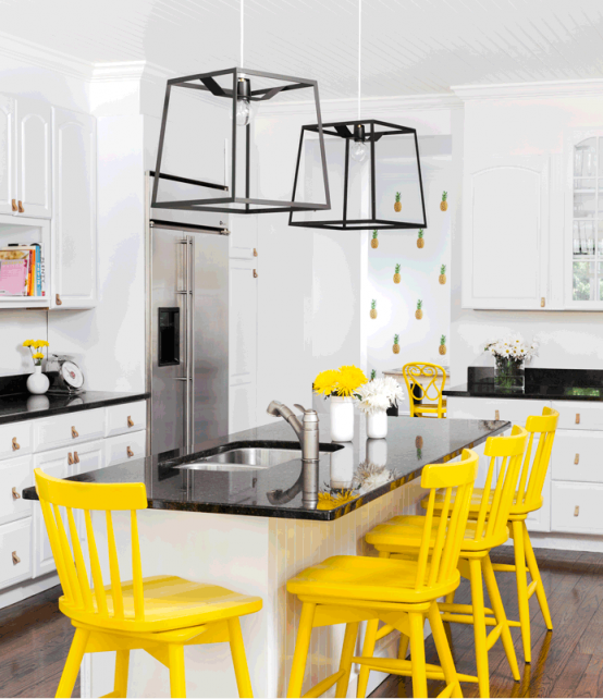 Cu siguranta, scaunele galbene din jurul insulei te vor inspira sa explorezi noi retete. Pe un fundal alb imaculat, accentele de galben ies in evidenta si te cuceresc de-a dreptul.