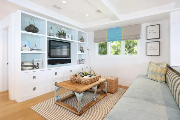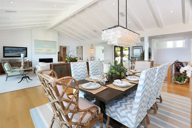 Petele de culoare de verde pal, bleu si turcoaz vin sa intregeasca tematica casei. Ferestrele late ocupa o portiune semnificativa din pereti, oferind o priveliste unica catre ocean. Practic, exteriorul se reflecta in interior prin gama coloristica aleasa. Tablourile mari, insotesc si ele tema decorului si ofera coeziune intregului spatiu.