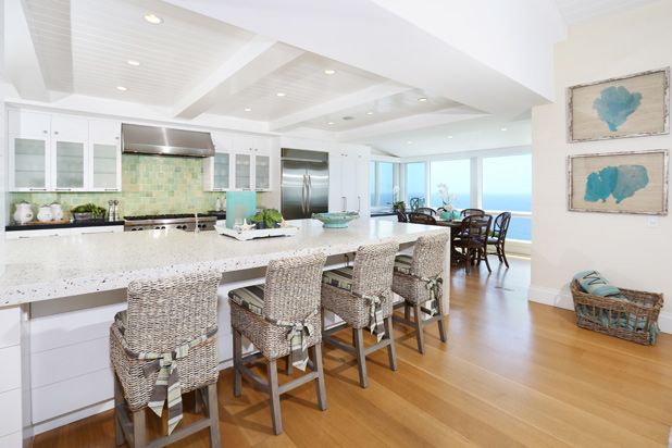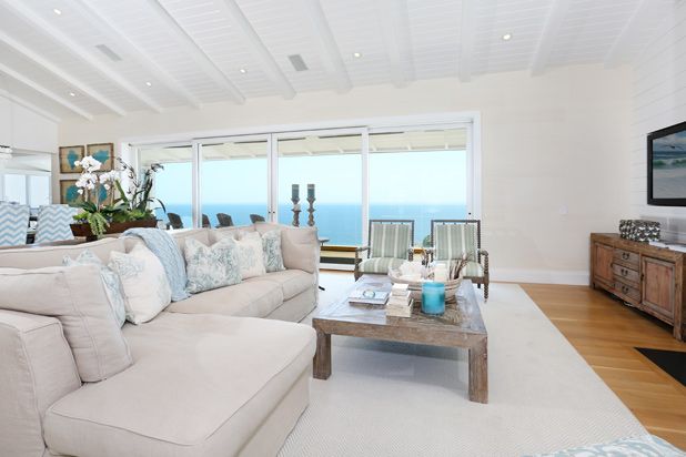 Petele de culoare de verde pal, bleu si turcoaz vin sa intregeasca tematica casei. Ferestrele late ocupa o portiune semnificativa din pereti, oferind o priveliste unica catre ocean. Practic, exteriorul se reflecta in interior prin gama coloristica aleasa. Tablourile mari, insotesc si ele tema decorului si ofera coeziune intregului spatiu.