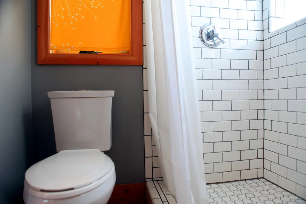 Baia, desi este foarte mica, este dotata cu tot ce ii trebuie unei bai normale, iar din punct de vedere estetic ofera niste imbinari indraznete de culori.
