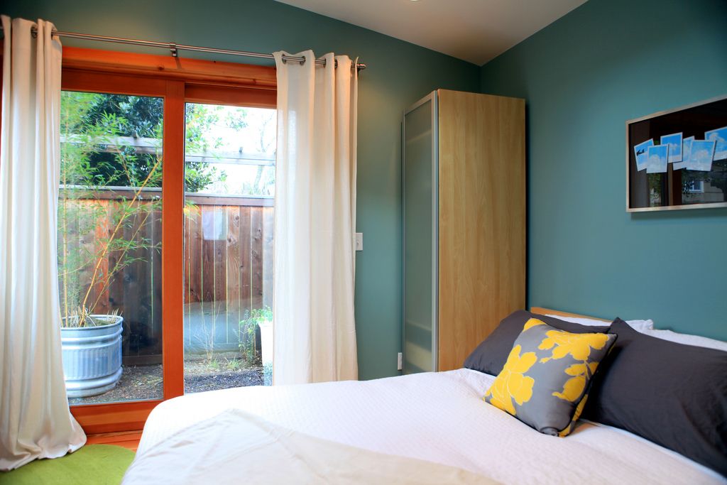 Dormitorul separat este dotat cu un pat mare, peretii sunt decorati cu vopsea ecologica de o nuanta foarte placuta, iar draperiile ofera camerei un are foarte intim. Usile duble dau spre o curte interioara unde musafrii sau proprietarii isi pot petrece zilele calduroase de vara.
