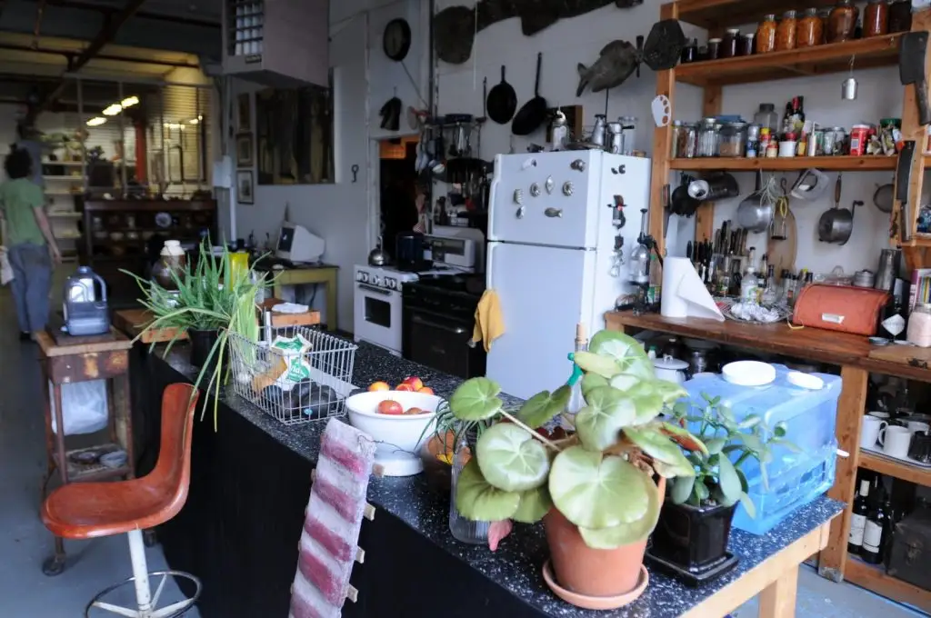 Bucataria este realizata intr-un spatiu deschis, cu rafturi si accesorii vintage, care aduc aerul unei cabane de la tara in interiorul casei lor, situata in centrul vechi al celui de-al treilea oras ca marime din Statele Unite ale Americii. Un televizor mic si vechi situat intr-un colt negru, care serveste in intregirea designului clasic-vechi al apartamentului.