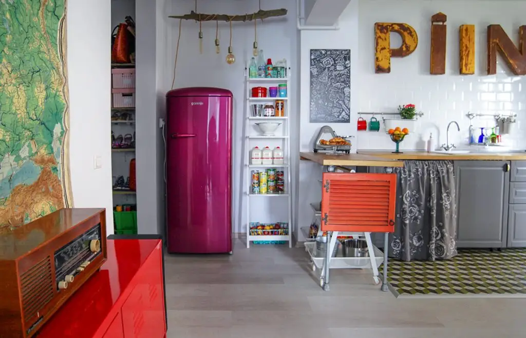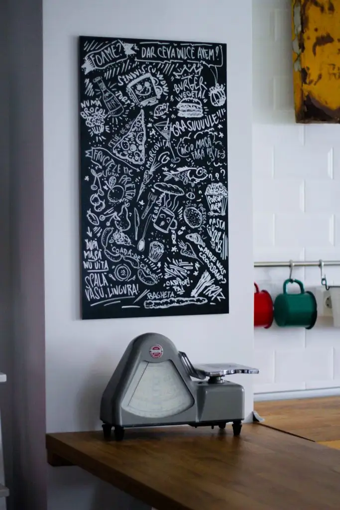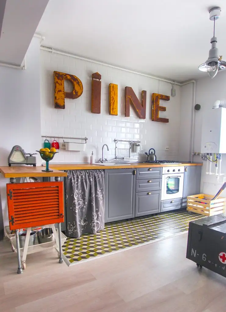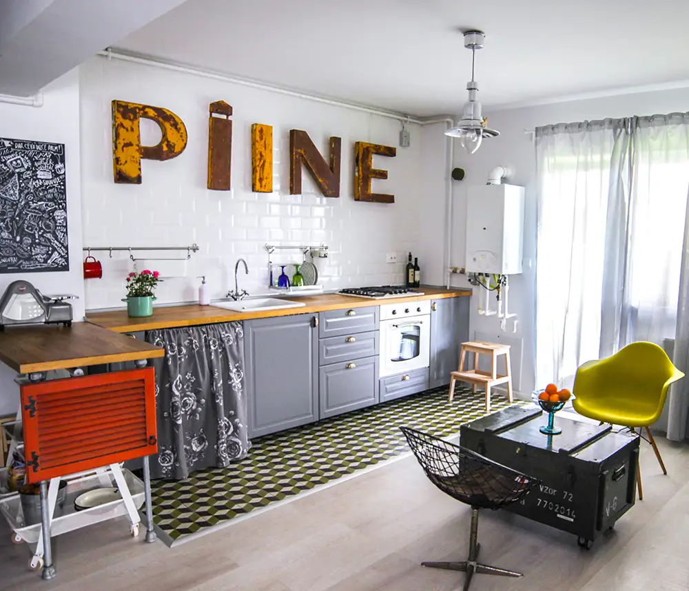 Bucataria este de departe preferata noastra. In aceleasi note retro, acest spatiu ne aminteste de vremurile copilariei prin accesoriile care definesc aceasta zona. Un astfel de exemplu sunt literele de pe perete (care provin de pe o cladire veche).
