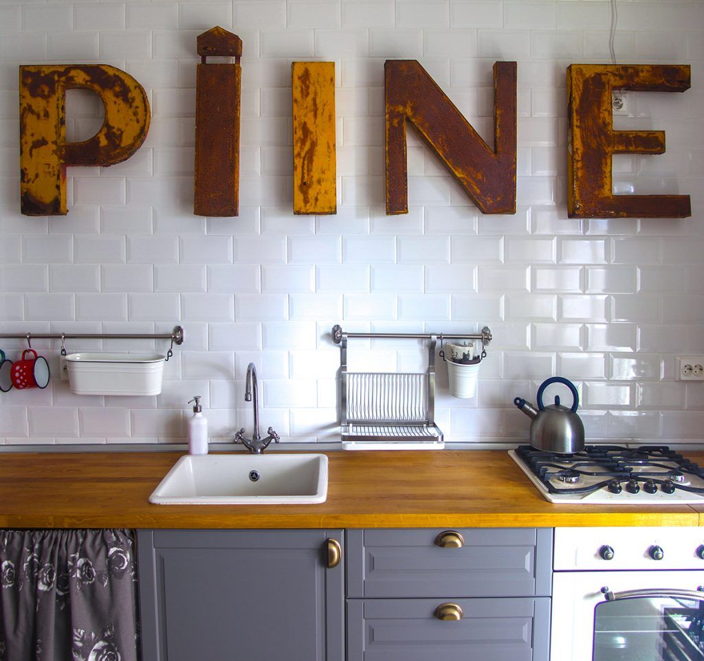 Bucataria este de departe preferata noastra. In aceleasi note retro, acest spatiu ne aminteste de vremurile copilariei prin accesoriile care definesc aceasta zona. Un astfel de exemplu sunt literele de pe perete (care provin de pe o cladire veche).