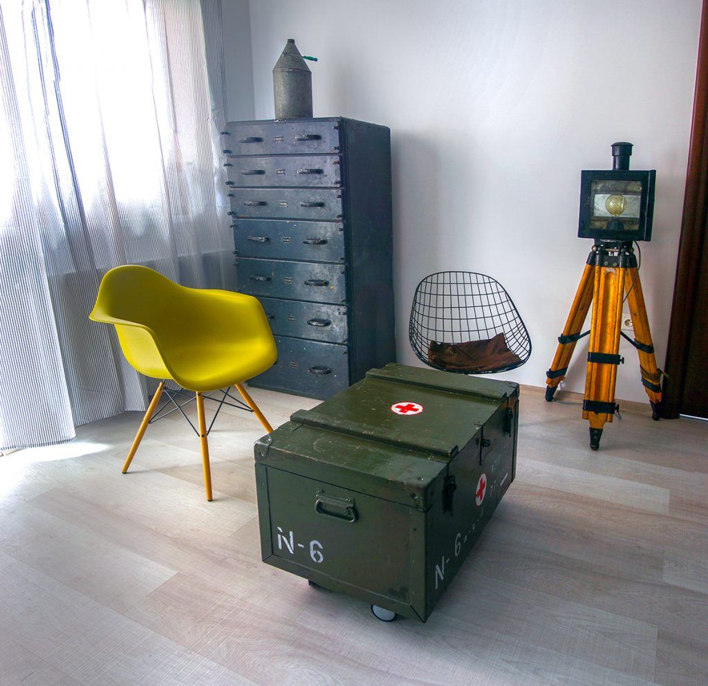 Si acolo am gasit dulapul metalic pe care l-am transportat cu noi pana la Sibiu si apoi pana la Bucuresti intr-o masina nu foarte spatioasa.” In acelasi registru industrial se incadreaza si masuta de cafea, o lada militara de la magazinul Kaki, careia i-au fost montate niste roti pentru a fi manevrata mai usor.