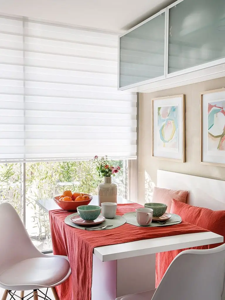 Optimizarea mobilierului principal pe o singura latura a permis si integrarea unei mici zone de luat masa; din dorinta de a spori zonele de depozitare, designerul a prevazut si pe aceasta latura a bucatariei doua dulapuri montate in partea superioara pentru a nu incarca vizual aceasta zona. Alegerea acelui rulou textil alb blocheaza lumina, dar fara a afecta luminozitatea camerei.