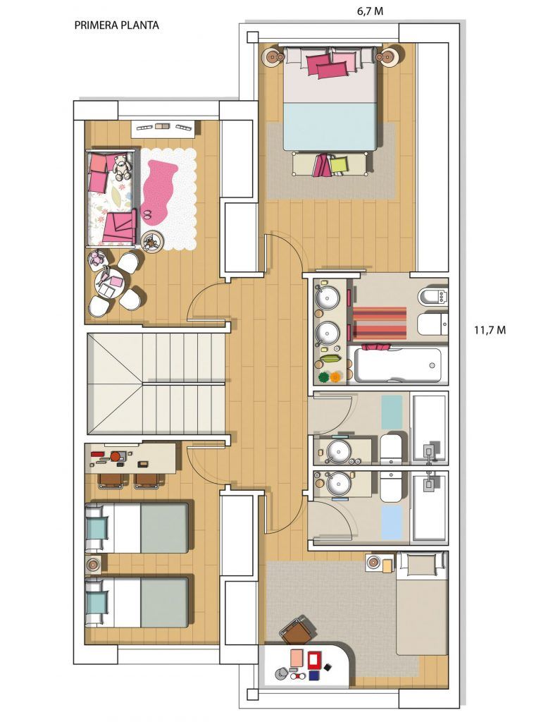 La etaj, au fost amenajate dormitoarele si baile. Aici, Paula a urmat aceeasi linie cu decoruri diafane si relaxante, cu baza neutra si accente cromatice vesele, mai ales in camerele copiilor.